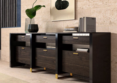 La colección se completa con accesorios, mesas de escritura y escritorios con acabados a juego que enriquecen armoniosamente los muebles.