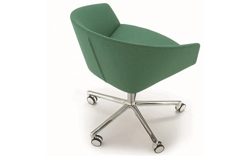 Sillones tapizados con asiento y respaldo realizado en espuma flexible. Disponibles con base de patín de varilla de acero, 4 patas de tubo de acero o cantiléver de pletina de acero maciza y acabado cromo brillo, 4 patas de madera maciza de haya, base central giratoria de madera maciza de haya o base central giratoria de aluminio de 4 aspas, con sistema de retorno y acabado aluminio pulido, blanco o negro y base central de 5 ruedas giratoria, regulable en altura y acabado aluminio pulido, blanco o negro. Butaca tapizada con zócalo de madera, disponible también en versión giratoria.