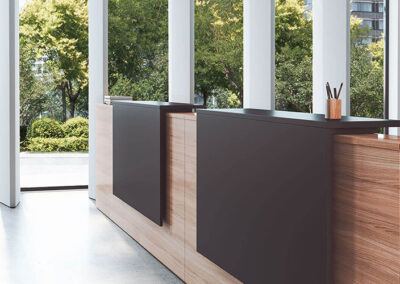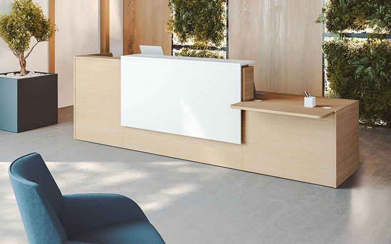 Superficie de trabajo en melamina de 25 mm de grosor en blanco o erable. Existen diferentes modularidades ergonómicas. Frontal del mostrador en diferentes acabados (metal, metacrilato y madera). Zona superior de atención en melamina erable o blanca y cristal azul